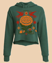This stylized modern folk design centers the sacred marigold — Cempasúchil — long seen as a guide between worlds. A symbol of spiritual passage, the flower honors cycles, transitions, and the unseen paths that connect us. The marigold marks the turning of the season — a time of harvest, remembrance, and return; a time of sacred ritual.
